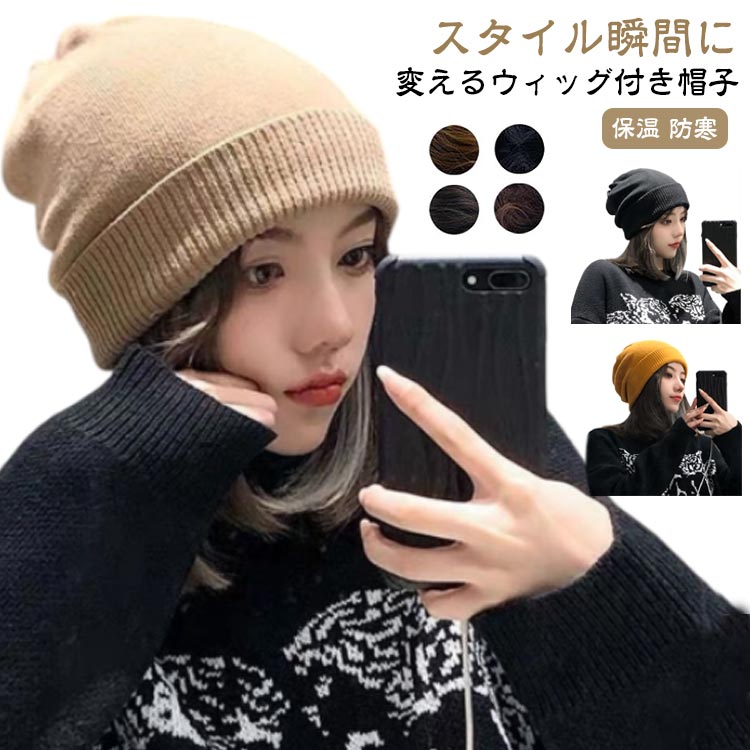 髪付き帽子 ウィッグ付き帽子 秋 冬 ニット帽 レディース 毛付き帽子 かつら付き帽子 セミロング…